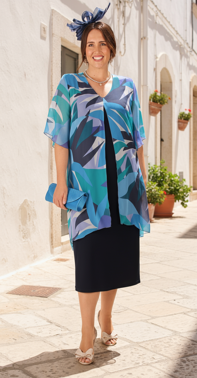 Chiffon Overlay Waterfall Dress Seascape over Navy