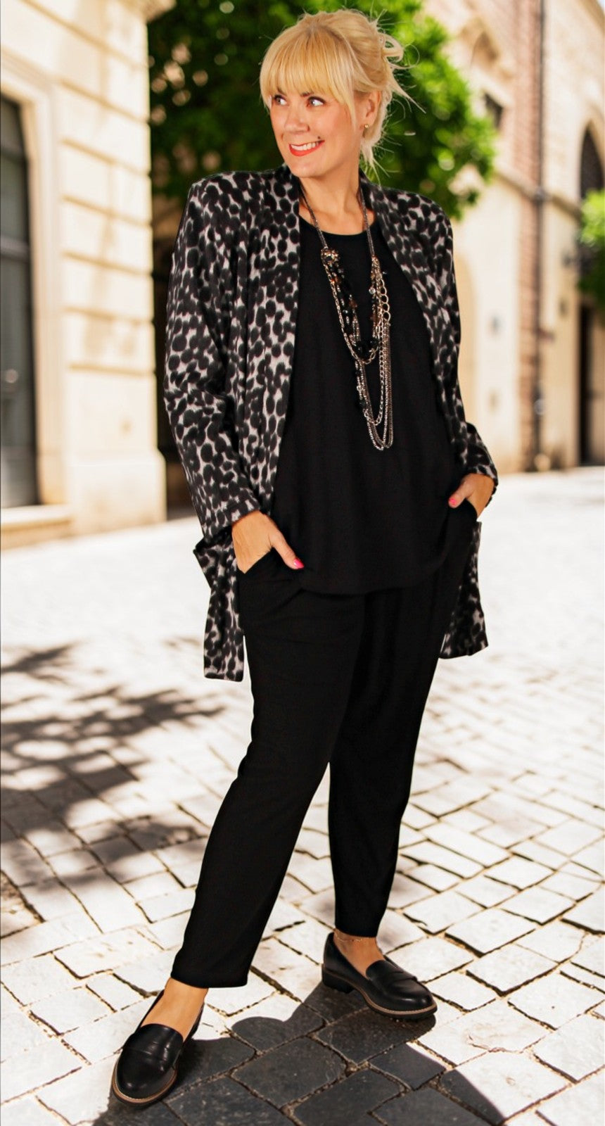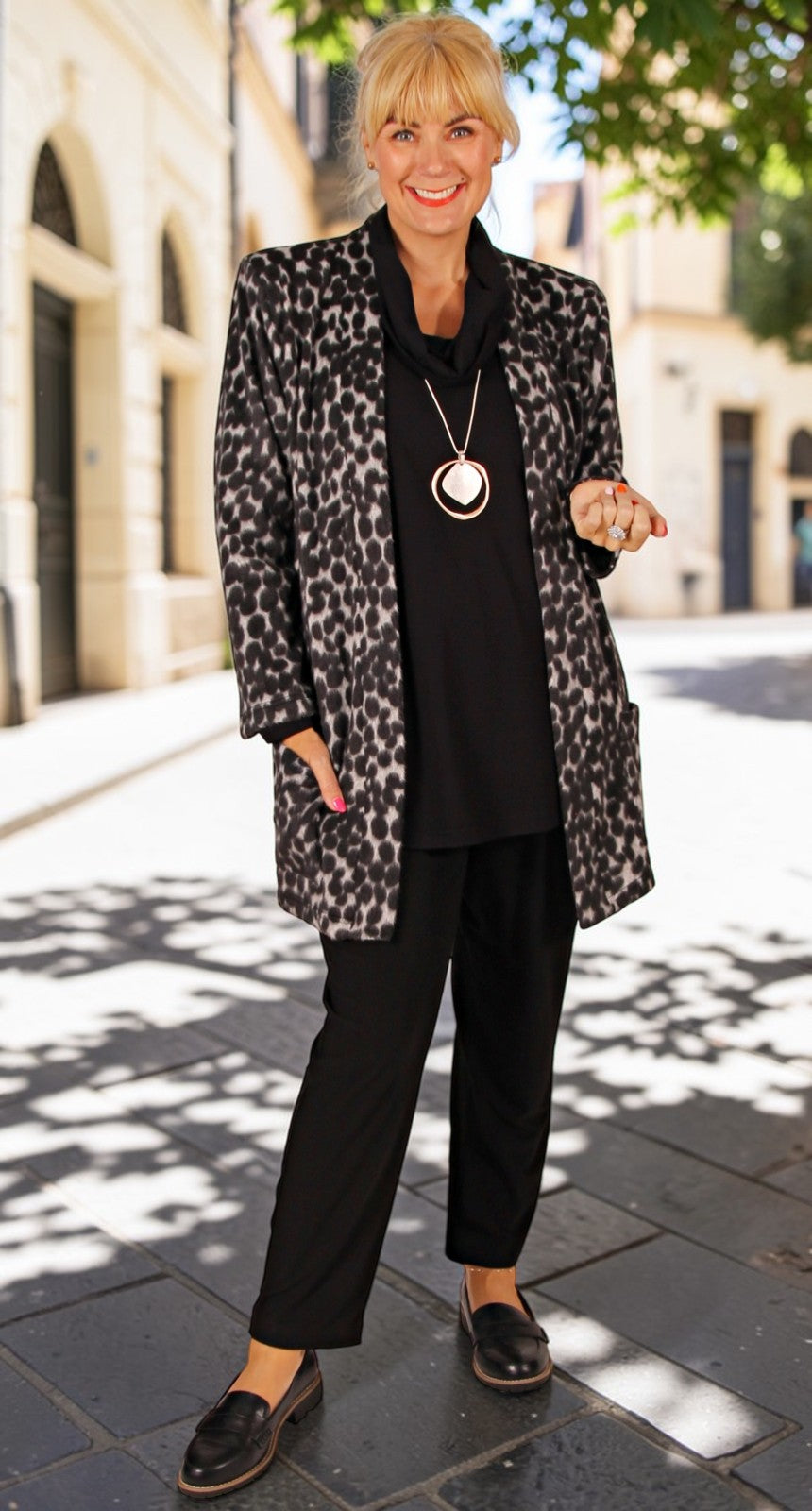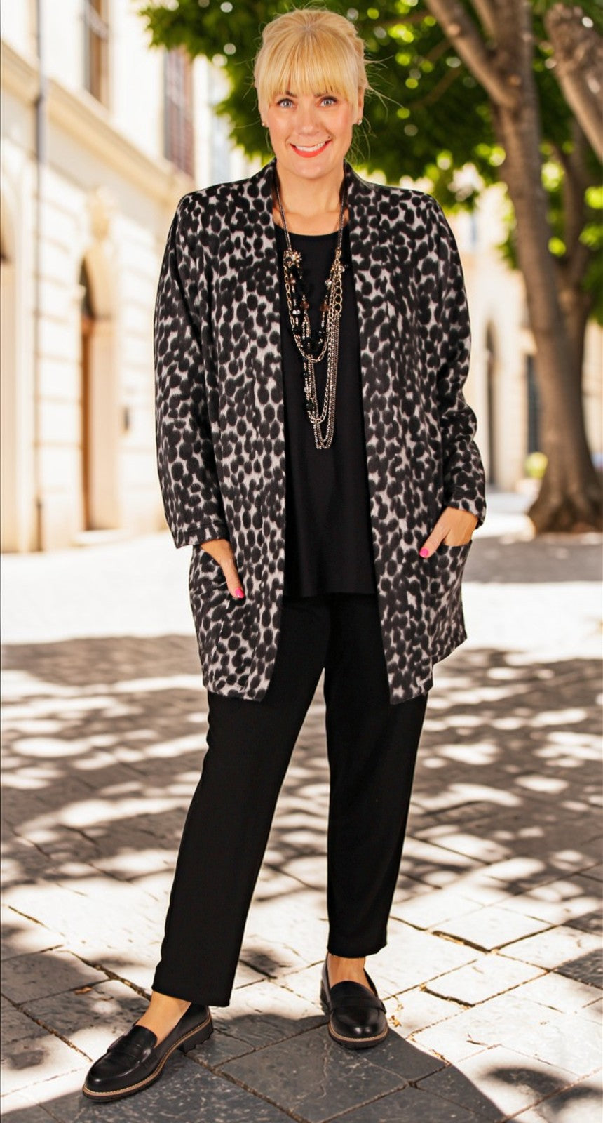 Fluffy Knit Edge to Edge Jacket Grey Leopard
