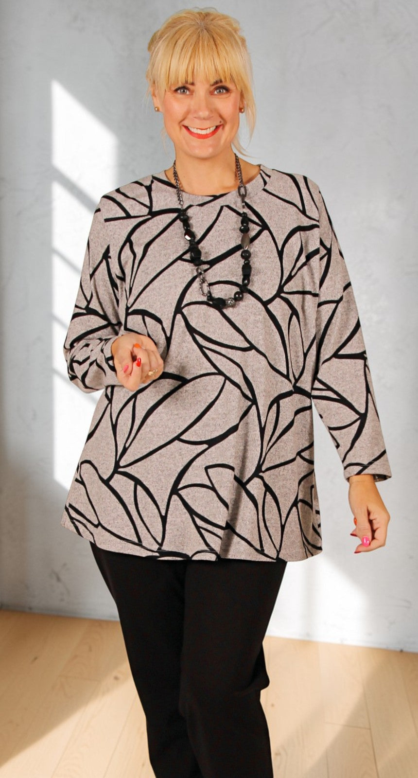 Our all-time favourite round neck tee top is back in a range of fabulous prints. This top is guaranteed to flatter all shapes and sizes with a classic crew neck, long length sleeves a modest length and a slight a-line shape for extra room around the hips. Wear these tops with any of our plain skirts or pants. The wash and wear stretchy jumper knit means it's great for travel too.