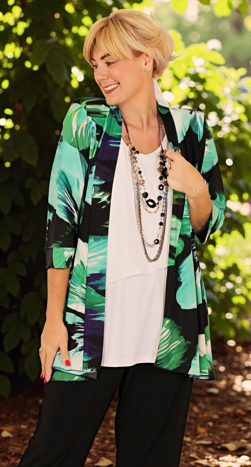 Sophisticated style in our edge-to-edge swing jacket. The soft polyester spandex jersey has a lovely feel and weight so that it drapes elegantly over the body. A roomy cut in a stunning scarf print design, this polyester spandex jacket will take you from desk to dinner. Wear it as a fashionable corporate look or to any event where you want to look and feel fabulous.