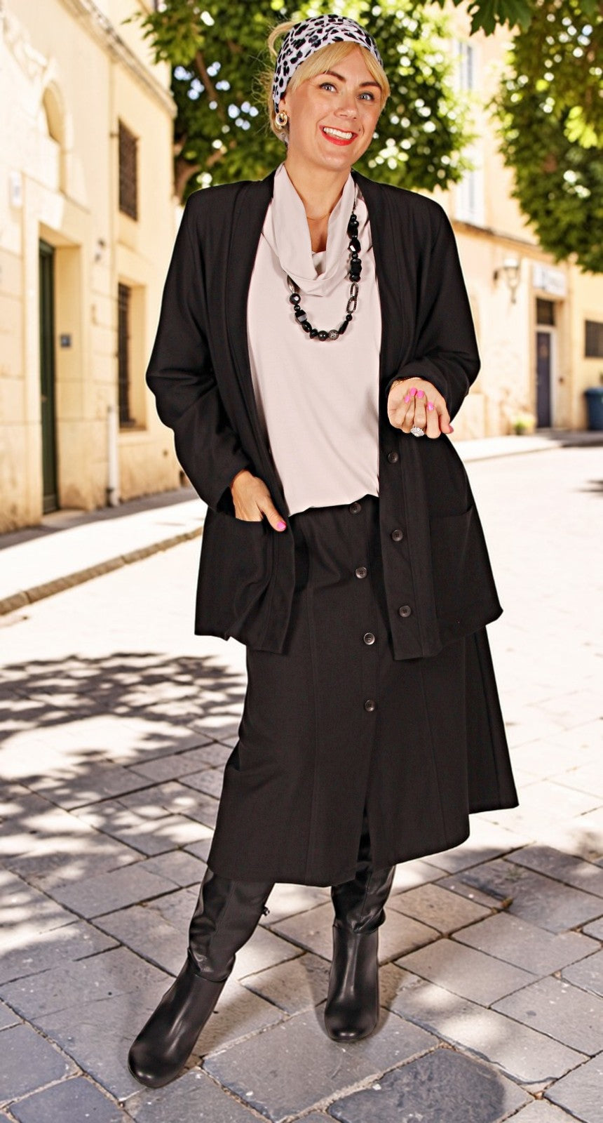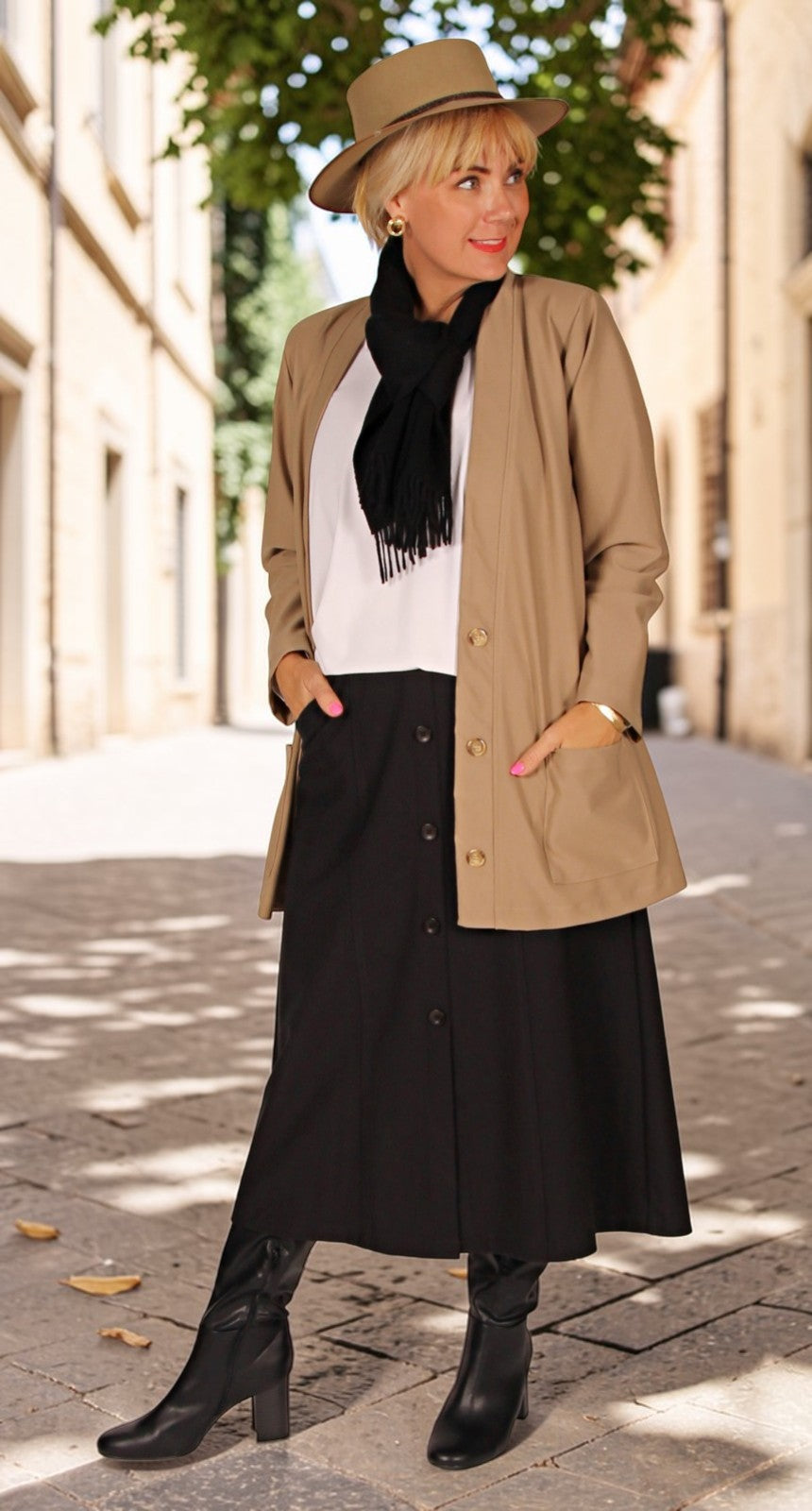Discover relaxed elegance with the Button Front Stretch Twill Weave Panel Skirt. This thoughtfully designed piece combines a flattering A-line silhouette with practical details that make getting dressed a pleasure. The medium-weight stretch knit fabric moves with you, offering gentle support while the stitched-down front eliminates gaping for a polished look. Patch pockets add a contemporary edge, and the modest length beautifully flatters your figure. Perfect for those who appreciate quality fabrics and timeless style that feels as good as it looks.