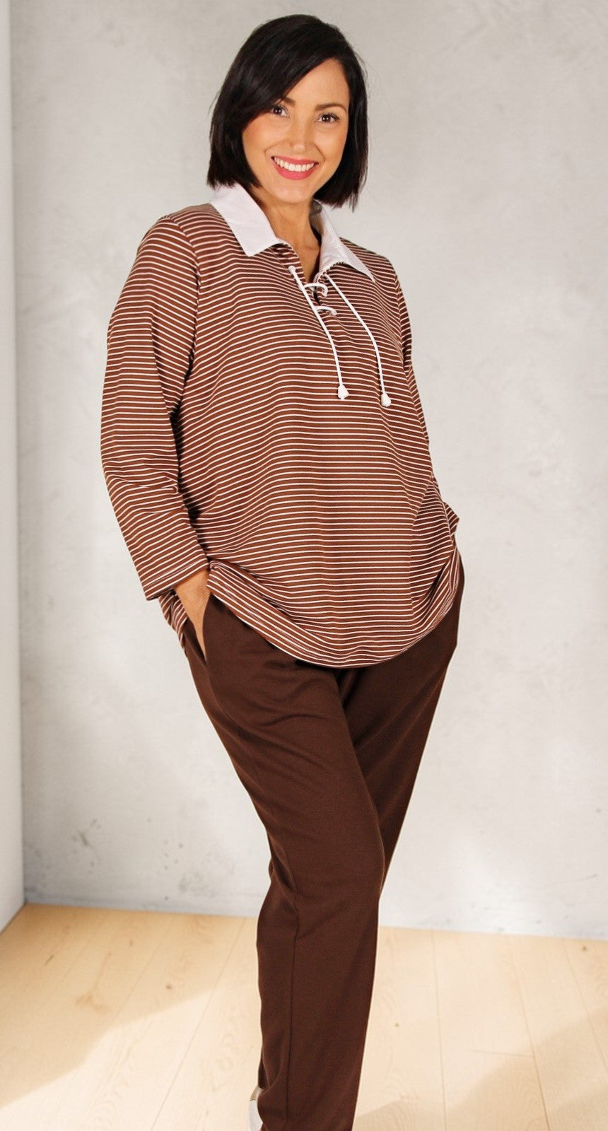 Sporty and relaxed our striped Johnny Collar Top a classic design that combines unbrushed cotton spandex fleecy with a relaxed fit and an A-line cut for ultimate comfort and style. Available in a variety of  stripes, this must-have piece features a lace-up front closure and a contrast cotton collar. At 32 inches or 82cms in length, it's the perfect addition to any wardrobe.