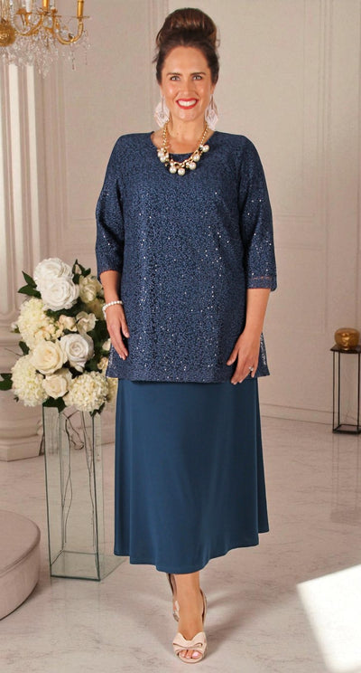 Chiffon Overlay Waterfall Dress Seascape over Navy
