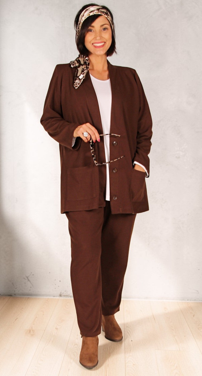 Stand out in style with the Cosy Ponti Knit Button Front Jacket. Crafted with a medium weight cosy knit fabric. This jacket offers the perfect balance of warmth and style. With a flattering longline silhouette you'll look stylish and stay comfortable all day long. The roomy sleeves and patch pockets add a modern touch to this classic look.
