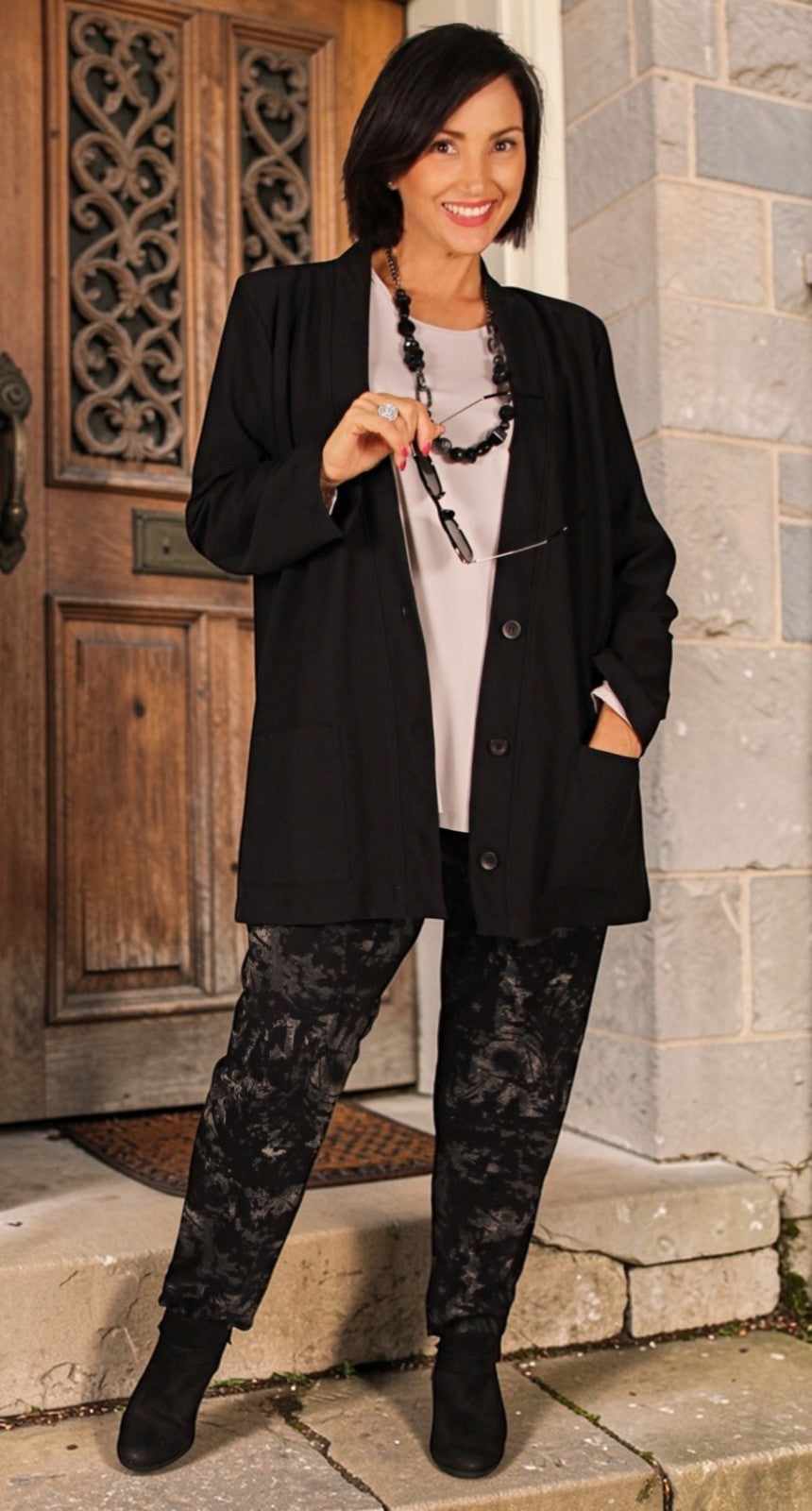I chose the button front stretch twill weave black jacket because it will pair back nicely with so many outfits for winter. It's a winter weight jacket ideal for the cold winters in Tasmania. Thanks to the team at Sybils, great advice and service always.